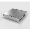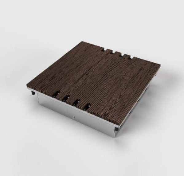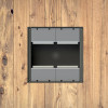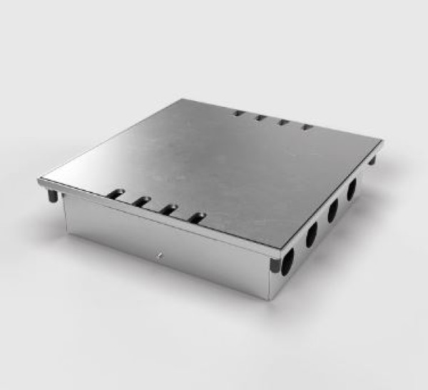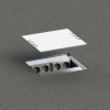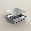 Gulvboks i natur eloksert aluminium. Komplett pakke. Gulvuttak laget av aluminium med deksel til å henge opp. Dekselet lukkes også i rett eller vinklet form når plugger er satt inn. Ideell for tepper.