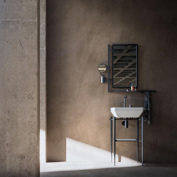 Rette linjer som finner kontinuitet og gir funksjonalitet med håndklekroker, hylle der man kan plassere produkter, Bluetoth om gjør speilet unikt. Rene, firkantede former, plassert side ved side. Kommer med 3X forstørrelses glass med magnet og tannbørsteholder med magnetfeste.