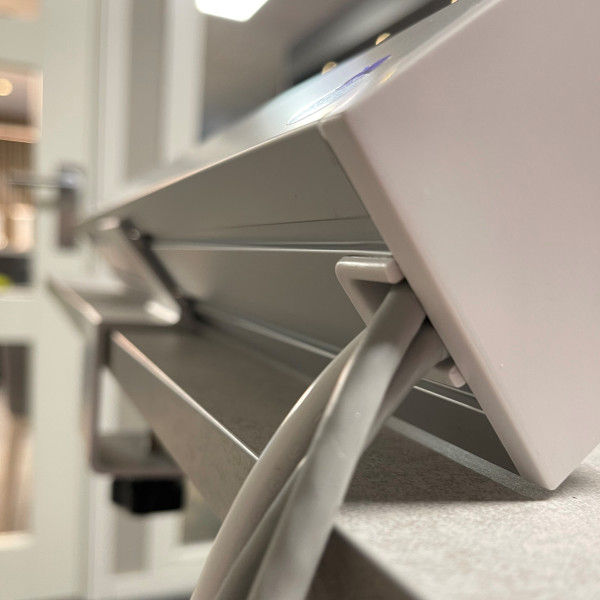Montering: Skru festet på bakside av arbeidsplatt. Plug i strøm, 230V. Kommer med 1,5m strømkabel med schuko støpsel + 2 CAT6 RJ45 kabler på 1,5m.