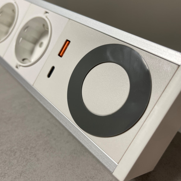 Uttak: 6 Schuko + 2 RJ45 cat6 + Qi-lader + 1 USB-A + 1 USB-C