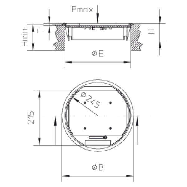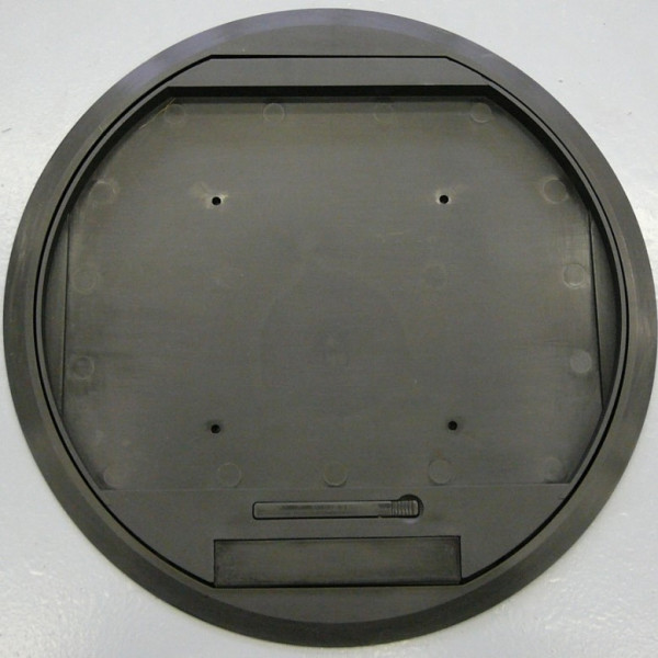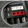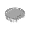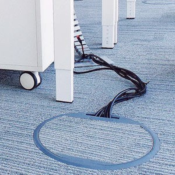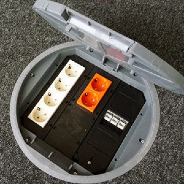 Rund installasjonsenhet laget av polyamid med teppebeskyttelsesramme Monteringsramme, kan ha 12 installasjonsinnretninger på 45x45 mm). Hengslet deksel med stålinnsats, kabeluttak i gulvet, som støvbeskytter, svingbar 180 °, og selvlåsende spak.