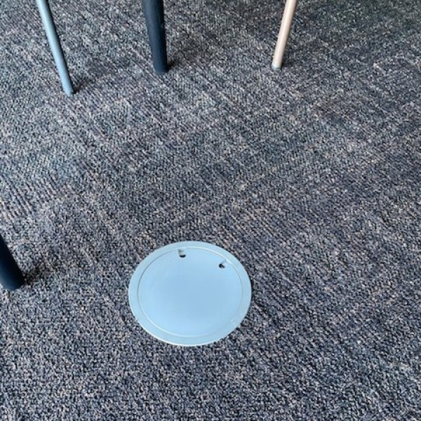 Gulvboks i natur eloksert aluminium med vendbart lokk, den ene siden er for ilegg av 5 mm teppe eller lignende. Den andre siden er blank. Komplett pakke.