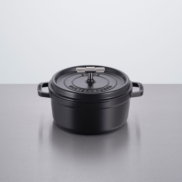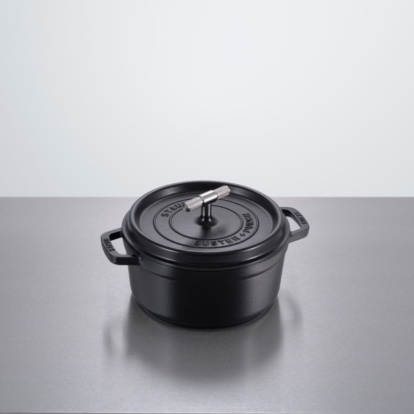 A hard wearing Staub cast iron cocotte in black, with enamel coating inside. Its lid has a solid metal Buster + Punch T-bar with signature B+P cross knurling in steel or brass PVD finish. The cocotte is heat-resistant up to 250°C and is suitable for oven use as well as