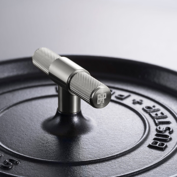 En svart cocotte i støpejern med et signatur T-håndtak fra Buster + Punch, med diamantkuttet kryssrifling for bedre grep og kontroll under bruk. Foredlet for hånd og designet for å passe sømløst med Buster + Punch sitt kjøkkendesign og -kolleksjoner. Tilgjengelig i stål- og messingutførelse. Et samarbeidsprodukt med Staub.