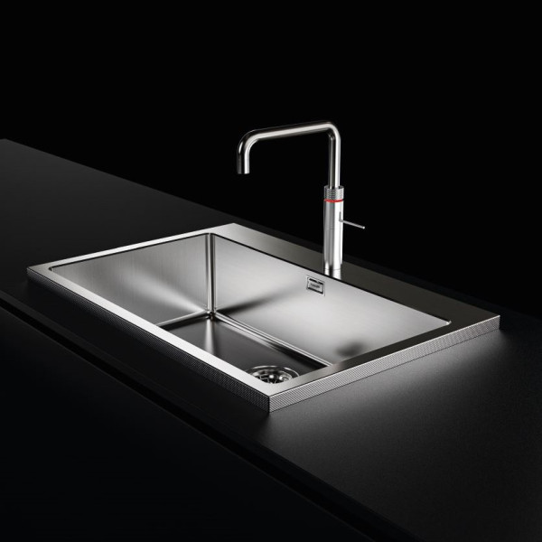 Foster har utviklet en vaskeserie med en 25 mm høy kant og det karakteristiske “made for Quooker” teksturmønsteret. Denne overflaten, som går igjen i hele kolleksjonen, skaper en perfekt estetisk helhet der vask og armatur fremstår som ett samlet designelement.