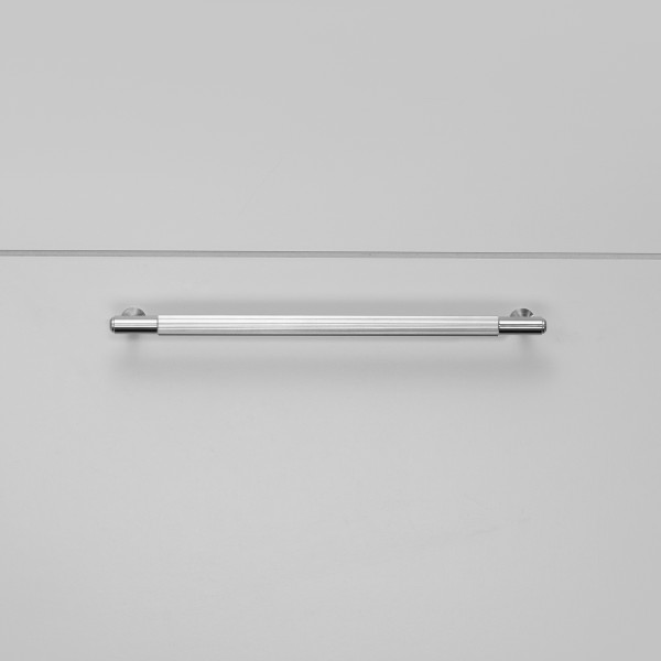 PULL BAR er laget av solid stainless steel metall eller i tre andre finisher. PULL BAR har B+P sitt signatur, diamantskårne, lineære riflemønster og er