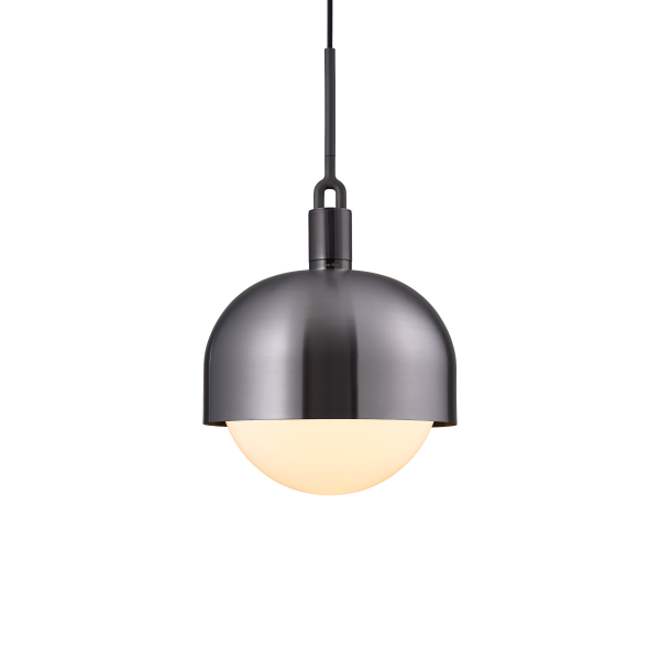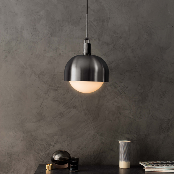 En pendellampe og skjerm, kombinere maskinert, håndspunnet og støpt solid metall, alt raffinert for hånd. Den har rollebesetningen vår