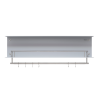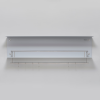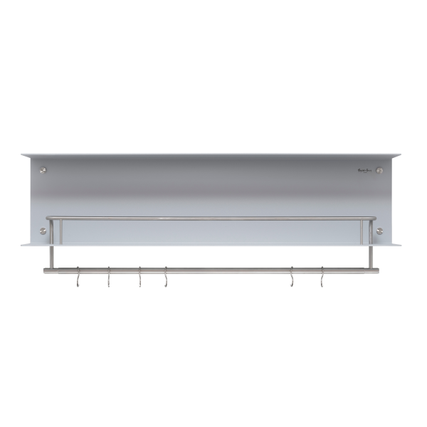 En hylle laget av laserkuttet, pressebøyd, 4 mm platealuminium, med glassskinne i 12 mm håndpolert solid metall. Denne hyllen har en 20 mm solid metallskinne.