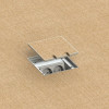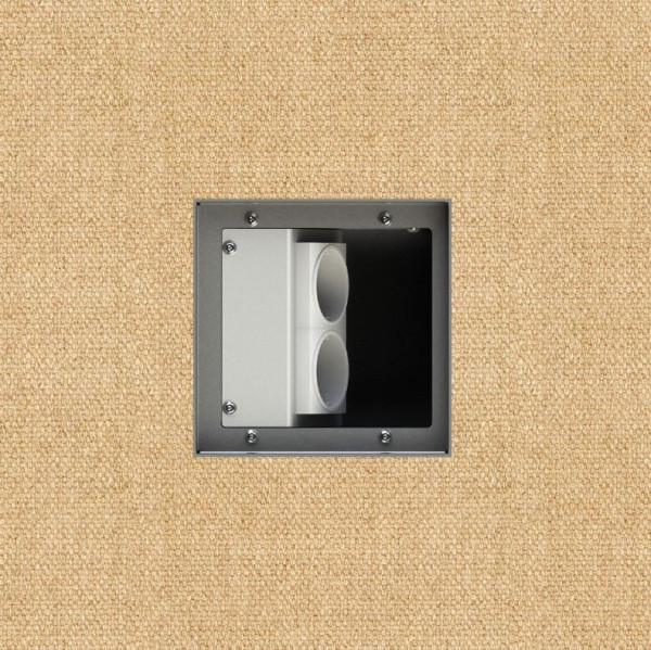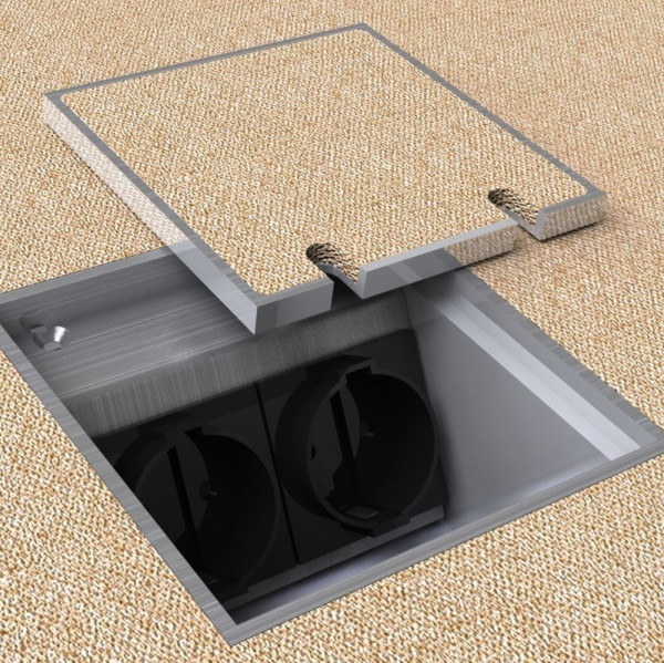 Gulvboks i natur eloksert aluminium med vendbart lokk, den ene siden er for ilegg av 5 mm teppe eller lignende. Den andre siden er blank. Komplett pakke. Gulvuttak laget av sluminium med deksel til å henge opp. Dekselet lukkes også i rett eller vinklet form når plugger er satt inn. Ideell for tepper. Deksel er i 1,5mm rustfritt stål.