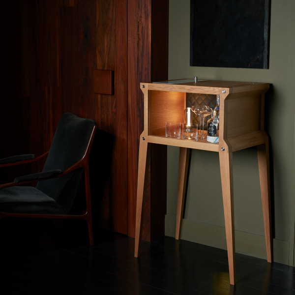 Popstar er et råstilig barskap med et unikt designuttrykk som garantert vil vekke oppmerksomhet hos dine gjester. Designet ble utviklet av Buster + Punch-grunnlegger Massimo Buster Minale. Barskapet er laget av massiv eik med innside av paneler med polstret svart skinn og belysning, med stilige detaljer som Buster & Punchs signaturskruer og strukturerte håndtak i stål. Toppen av Popstar er utstyrt med et elegant marmorbrett, slik at du kan tilberede og servere drinker pent og enkelt. Popstar barskap kommer med avtakbare ben som gjør det enkelt å montere og flytte mellom rom og inn i hjemmet ditt. Popstar er tilgjengelig i to design, naturlig eik og svart eik.