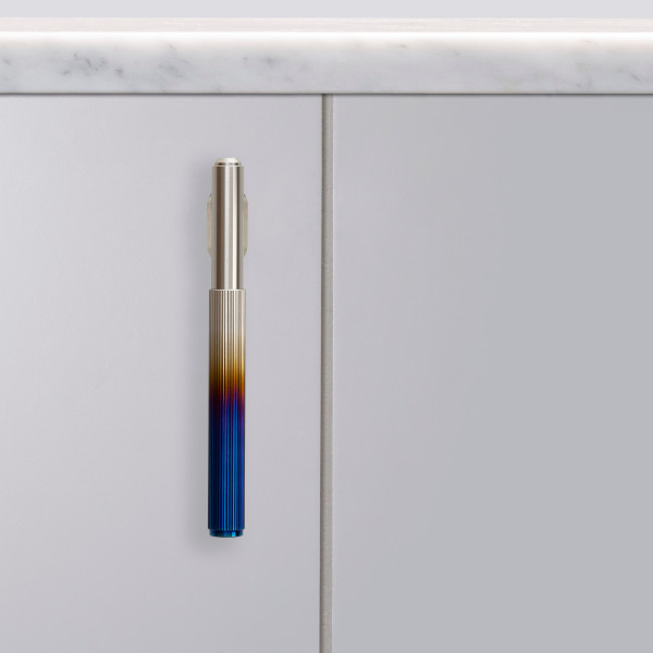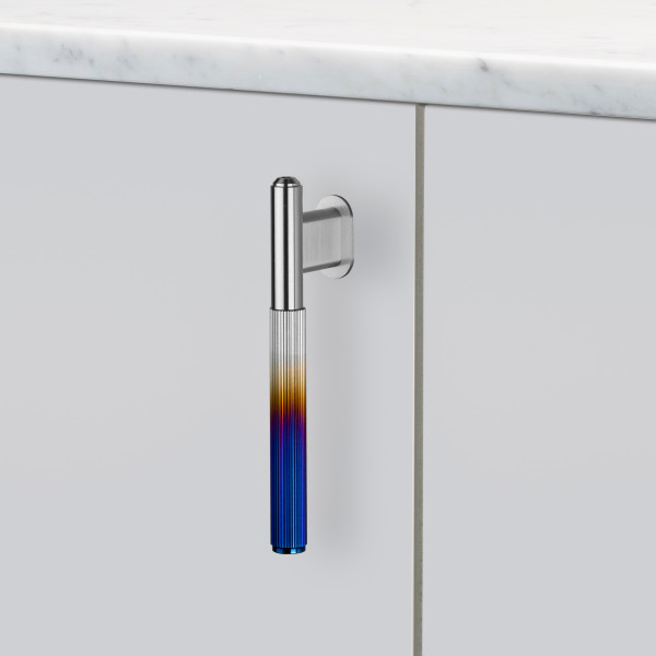 BURNT STEEL® finishen er utsatt for overdreven varme for å skape vår unike og patenterte finish. En regnbue av farger: blå, lilla og gul, sørger for at ingen overflater ser lik ut. L-BAR har vB+P sitt signatur, diamantskårne, lineære riflemønster og er produsert for hånd i London og designet er