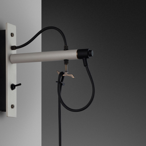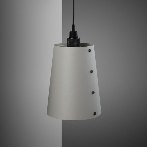anheng med matt sorte gummidetaljer. En solid krok gjør at anhenget kan hektes på lyset og kabellengden tilpasses. Lyset kommer med en liten skjerm laget av grafitt pulverlakkert metall og ferdig med skruer i fargen man velger. Denne vegglampen kan kobles inn i veggen eller utstyres med en utenpåliggende kabel og kontakt.