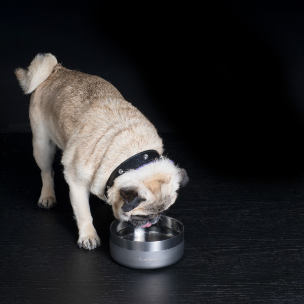 En hundeskål laget av presset rustfritt stål, i messing med børstet og sandblåst finish, med en subtil, preget B+P-logo. En silikonstøtfanger under hindrer glidning.