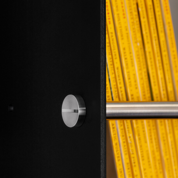 En kraftig hylle laget av laserkuttet 4 mm arkaluminium, presset bøyd i form og pulverlakkert. Hyllen har en håndpolert, 12 mm solid metallskinne og 20 mm panneskinne, begge ferdig med matchende Buster + Punch myntskruer.