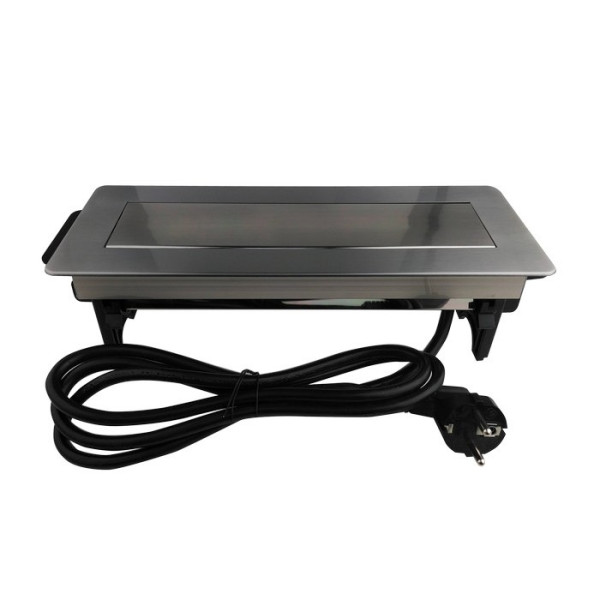 Produktet er et nedfelt uttak for hjemmet eller kontoret. Produktet har et flott design i stainless steel, noe som gjør den solid og slitesterk.
