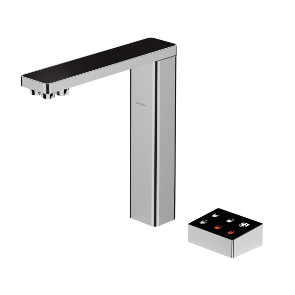 Elektronisk vaskekran, 4 luftere 18×1 med 4 uavhengige fordelingsrør laget av PFC, berøringsplate for romtemperatur, kald stillestående og glitrende, kokende vann 3 l/min strømningshastigheter. Sikkerhetslås som hindrer forbrenning. Monteringsstøtte med 3 skruer, LLDPE matrør med hurtigkobling, avskjæringsventil, strømningsregulator. Komplett med mikrofiltrering anti-kalksystem, CO2 oppladbar sylinder (UN 1013 karbondioksid 2.2 (C/E), 425 gr. kapasitet ladet, kjøler med integrert kjele komplett med elektronisk gruppe Guglielmi teknologi. CE-merket elektronisk.
