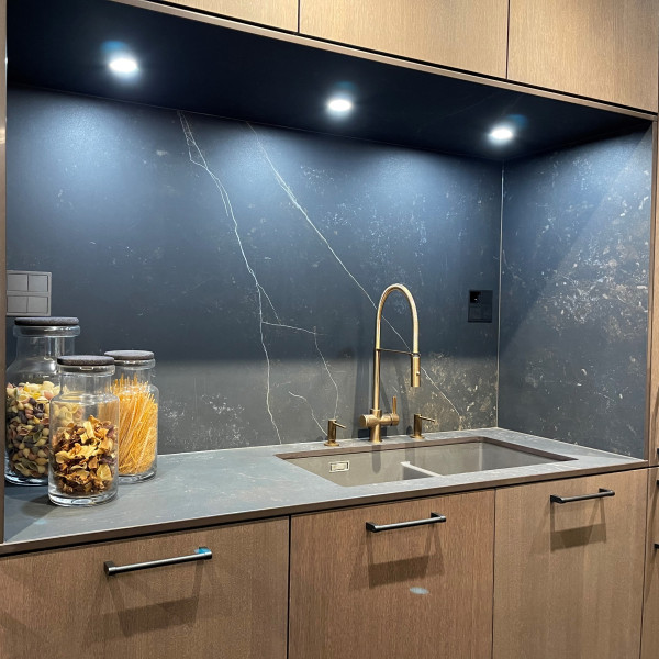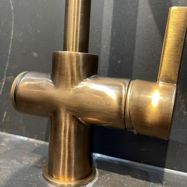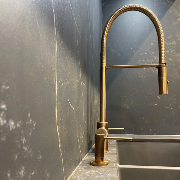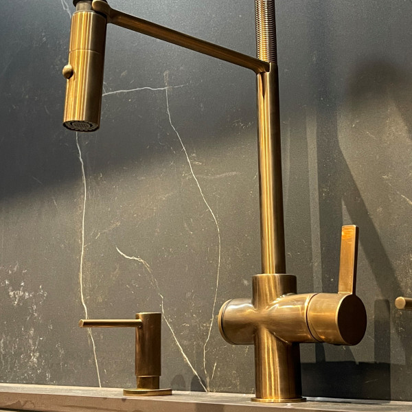 Innovativt og teknologisk system for åpning og lukking av vaskeavløpet integrert i kranhuset, berøringssystem plassert på venstre håndtak på kranhuset. Syntese av funksjonalitet og teknologi, det første, unike og revolusjonerende kjøkkenprosjektet som gjør det mulig å unngå hull i kravene til et globalt marked som alltid gir mer brukbare overflater, fri for hindringer, i tråd med den elegante og unike stilen til kjøkkenet ditt.