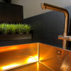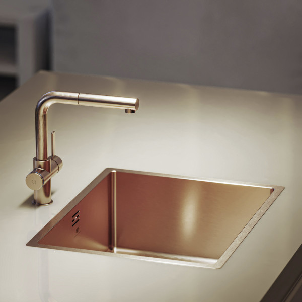 Innovativt og teknologisk system for åpning og lukking av vaskeavløpet integrert i kranhuset, berøringssystem plassert på venstre håndtak på kranhuset. Syntese av funksjonalitet og teknologi, det første, unike og revolusjonerende kjøkkenprosjektet som gjør det mulig å unngå hull i kravene til et globalt marked som alltid gir mer brukbare overflater, fri for hindringer, i tråd med den elegante og unike stilen til kjøkkenet ditt.