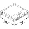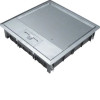 Firkantet gulvboks med 12 uttaksplasser for montering i kjerneborede hull, nedstøping, tregulv eller datagulv. Lages i Edelstål med stålforsterking i lokket og tåler 150 kg belastning. Leveres med bestykning.