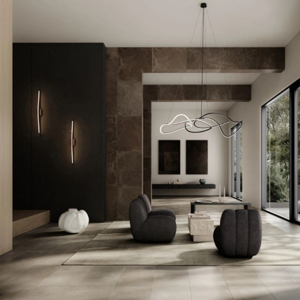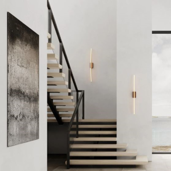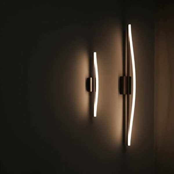 Serien finnes i to vegglampestørrelser samt en gulvlampeversjon, alle designet med arkitektonisk presisjon. Vegglampen festes til en slank, rektangulær bakplate som skaper en diskret dybdevirkning mellom lampen og veggen. Gulvvarianten forankrer den svevende lysbuen til en skulpturell metallkule – en vakker kontrast mellom det lette og det solide.