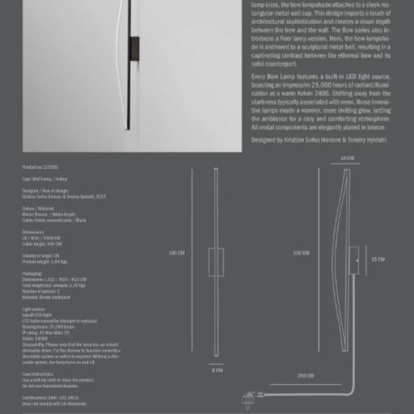 Inspirert av den elegante buen på en klassisk bue, forvandler Bow-lampene lys til skulpturelle kunstverk. Den lysende akryl-tuben – som minner om en spent buestreng – sprer et mykt og innbydende lys i et raffinert, minimalistisk formspråk.