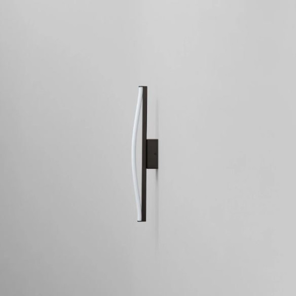 Serien finnes i to vegglampestørrelser samt en gulvlampeversjon, alle designet med arkitektonisk presisjon. Vegglampen festes til en slank, rektangulær bakplate som skaper en diskret dybdevirkning mellom lampen og veggen. Gulvvarianten forankrer den svevende lysbuen til en skulpturell metallkule – en vakker kontrast mellom det lette og det solide.
