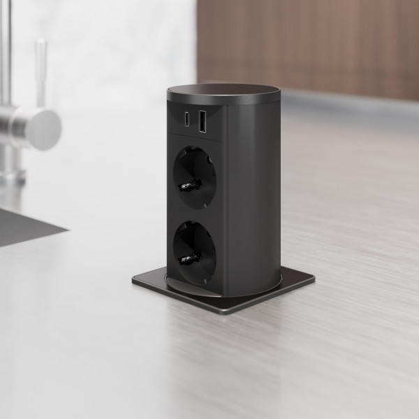 VersaLift er et innovativt IP54-sertifisert skjult strømforsyningstårn designet for kjøkken. Med en kompakt diameter på 80 mm, kombinerer den sømløst minimalistisk italiensk design med eksepsjonell funksjonalitet.