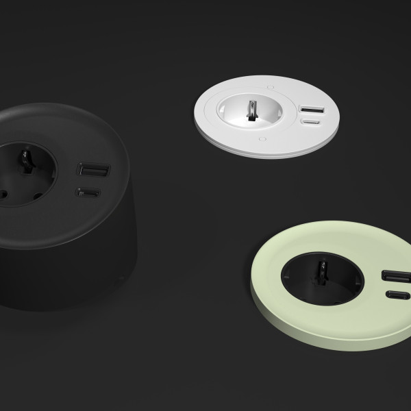 VersaSpot er en elegant og fleksibel modul med 1 stikk + 2 USB (A+C - 18W). Bygger kun 39mm ned. Passer i hull på Ø80mm hull.